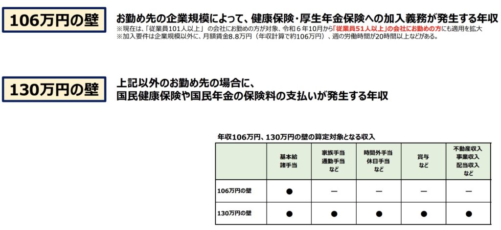※月額8.8万円(年約106万円)以上(今後撤廃予定)・週20時間以上・2ヶ月以上勤務・学生でない・従業員51人以上(今後減ってく)である時