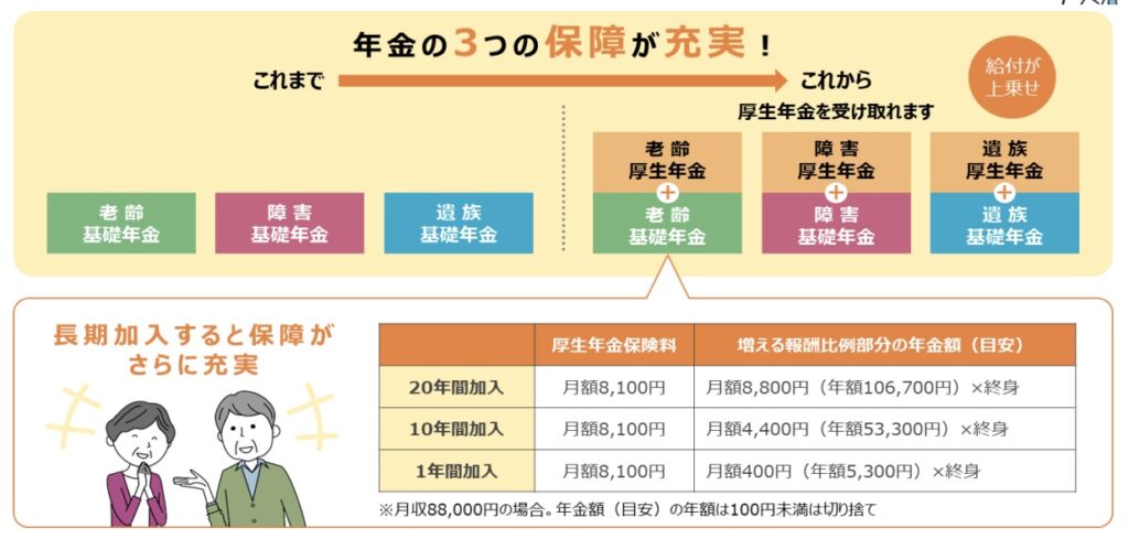 厚生年金加入者は、基礎年金に加えて厚生年金が上乗せ支給されます。