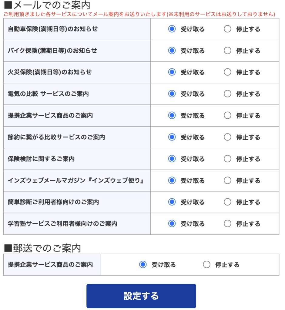 受け取る・停止するを選び、設定するをクリックすることで、不要なメールは届かなくなります。