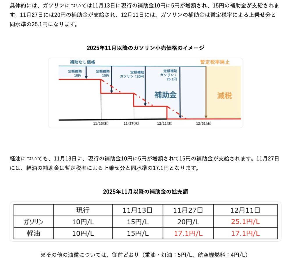 2025/11/13〜補助金を2週間ごとに拡充、12/11にはガソリン25.1円/L相当まで下がるようです。(ガソリン暫定税率分)